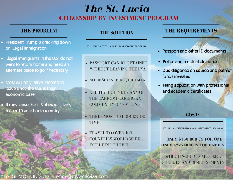 St. Lucia is a small country in the Caribbean that offers would-be immigrants the chance to gain citizenship by investing in St. Lucia's National Economic Fund which secures for the immigrant and his family the right to come and live in that country. As an added benefit, such an investor citizen gains the ability to live in any of the other 19 CARICOM community of nations and travel to over 100 countries worldwide, including the E.U. While the investment amount required varies depending on the size of the investor's family and the Caribbean country chosen, for the sake of simplicity, an investment of say, $150,000 U.S. (all costs included) for an individual, or say $225,000 U.S. in the case of a family, will secure them the right to leave the U.S. and come to live in the Caribbean. Importantly, the actual payment comes as the last step in the process, only after the investor has been approved by the target country. In short, with such passports, the investor and his family can fly to the Caribbean to settle, if deported.